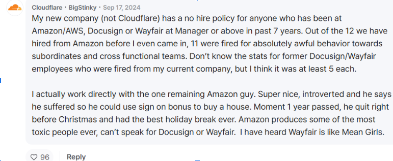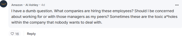 Amazon employees questioned whether anyone would even consider hiring those toxic, laid-off managers. Some even claimed that their companies had an unofficial policy of not hiring ex-Amazon managers!