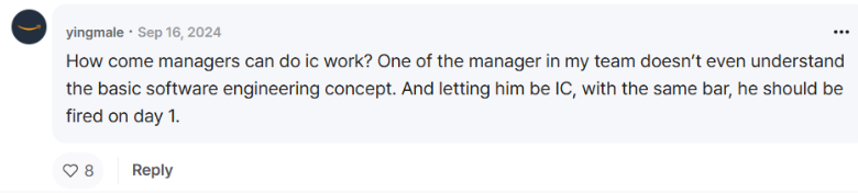 The Blind community swarmed to the narrative like flies on a fresh pie, supporting the move by claiming that their managers contributed little value, lacked real business understanding, had no technical skills, and merely "played the corporate game." They argued that most managers would be unable to hold onto their jobs if forced to transition into IC roles.